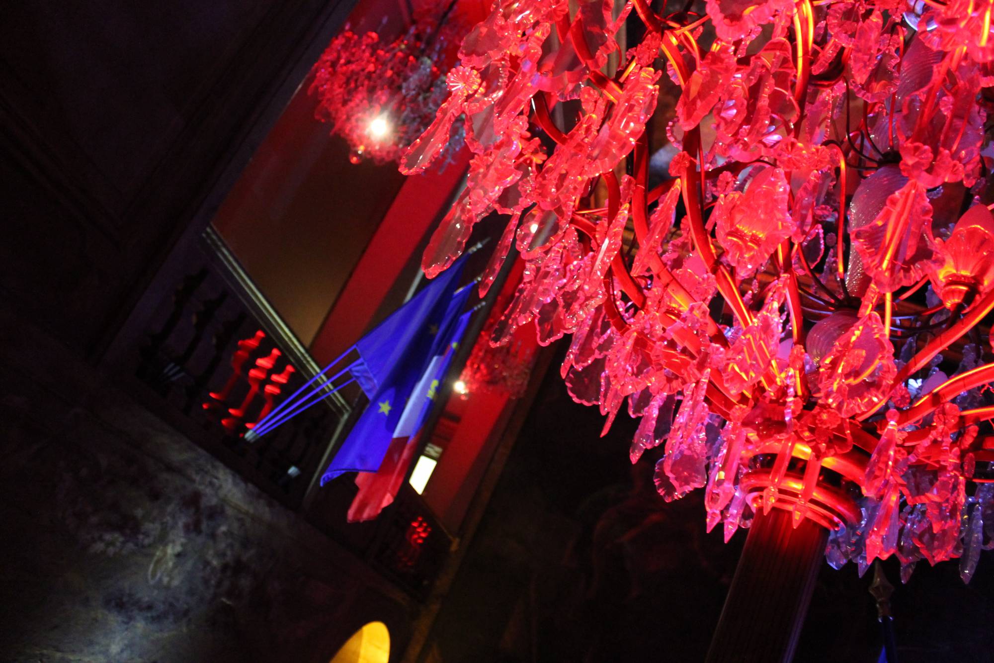 L’équipe s’est également chargée de toute l’ambiance lumineuse de l’entrée avec l’éclairage de la montée d’escalier et des drapeaux des différentes nationalités. Pour cet éclairage, nos barrettes led autonomes Freekolor et nos projecteurs autonomes Boxkolor étaient parfaits.