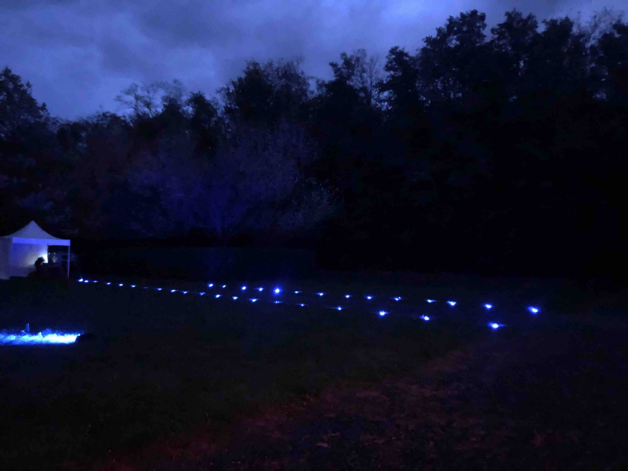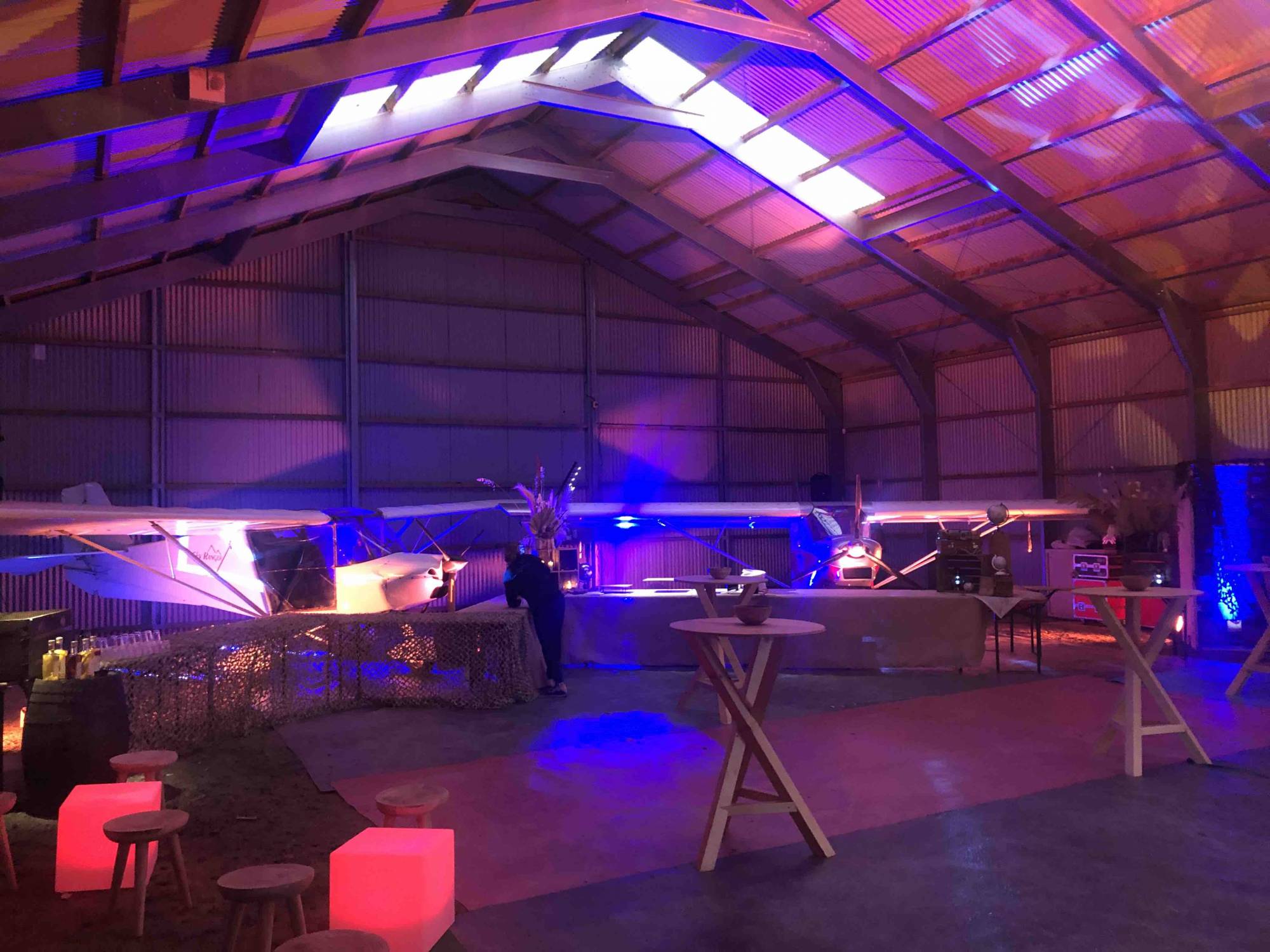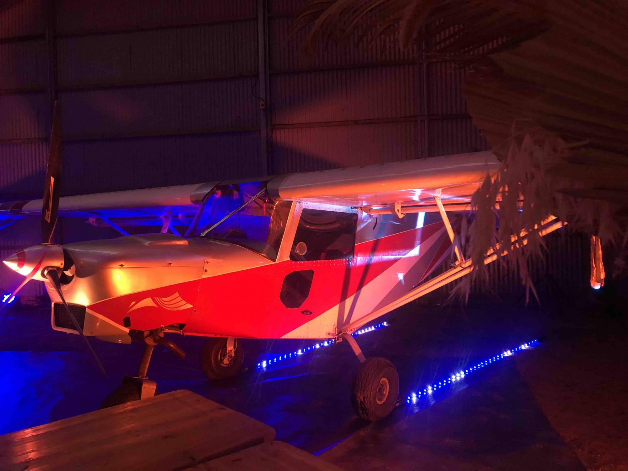 L’ULM installé à l’intérieur, était sublimé par 4 projecteurs punch light et 2 lyres MK1 spot. Sa piste d’atterrissage était simulée par l’installation de fils lumineux. Ces mêmes fils lumineux, servaient également de signalétique à l’extérieur, pour indiquer l’accès au lieu, depuis le parking.