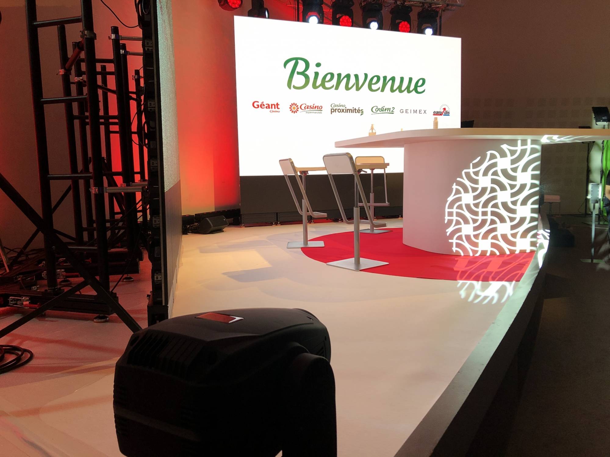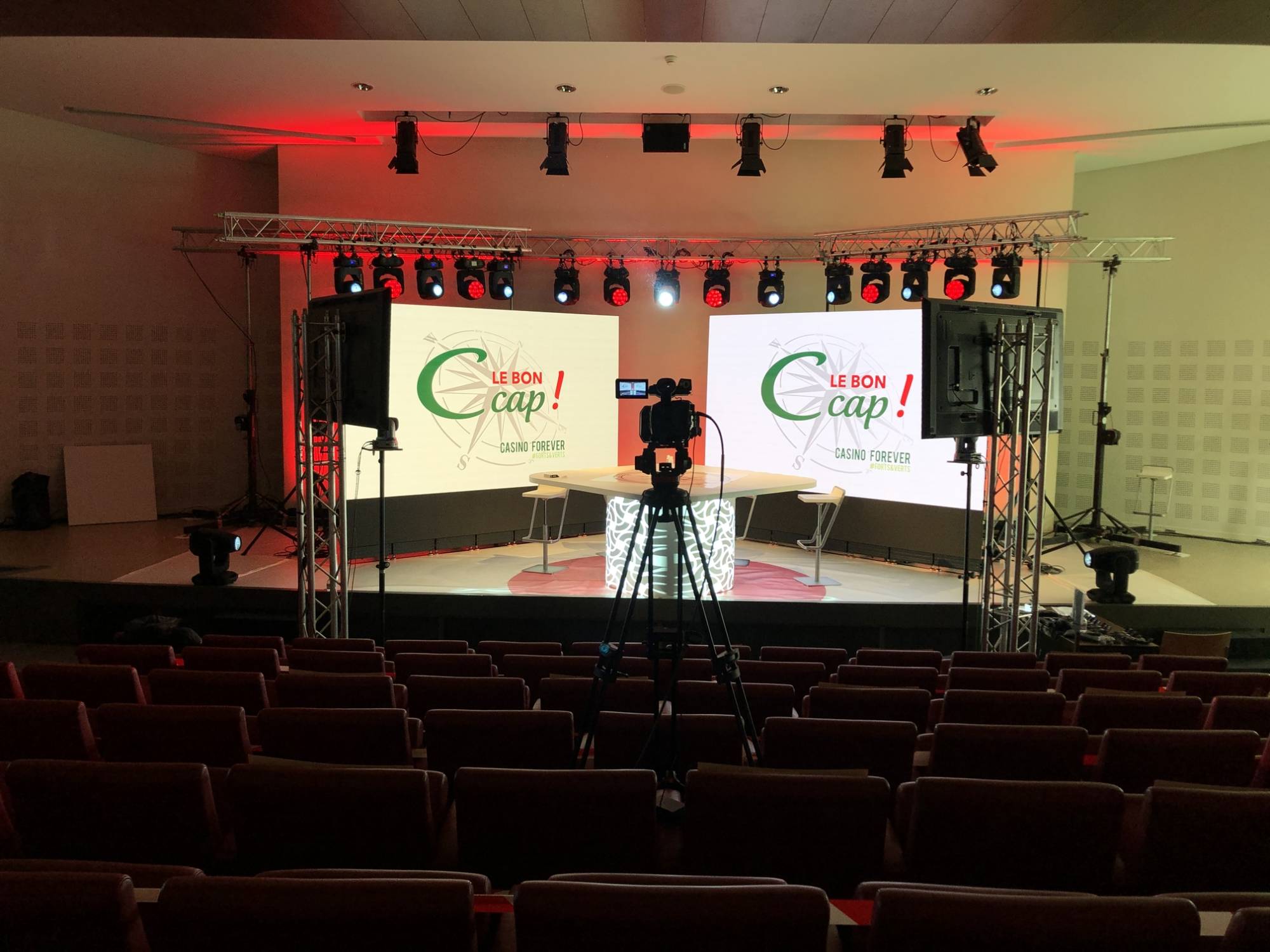 Tout d’abord, le montage de la structure scénique est essentiel afin de fixer notre équipement. La structure scénique était adaptée à la configuration du lieu de la convention afin de créer un plateau TV.